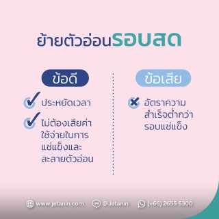 ข้อดีของการย้ายตัวอ่อนรอบสดคือประหยัดเวลา และลดค่าใช้จ่ายจากการแช่แข็งและการละลายตัวอ่อน แต่จากการศึกษาพบว่า การย้ายตัวอ่อนรอบสดมีอัตราความสำเร็จในการตั้งครรภ์ต่ำกว่าการย้ายตัวอ่อนรอบแช่แข็ง ปัจจุบันจึงนิยมย้ายตัวอ่อนรอบแช่แข็งเป็นส่วนใหญ่ เพราะมีข้อดีคือช่วยลดปัญหาภาวะรังไข่ถูกกระตุ้นมากเกินไป อัตราความสำเร็จสูง และเหมาะกับคู่สมรสที่ต้องการตรวจโครโมโซมตัวอ่อน